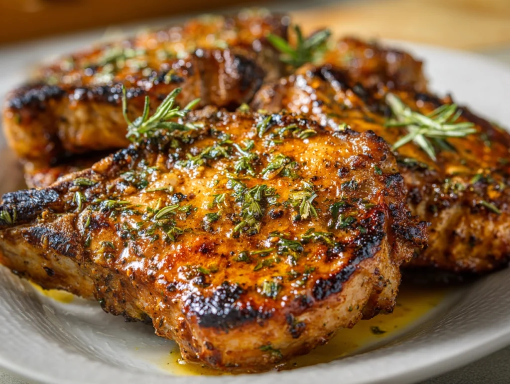 Marinated pork chops pair beautifully with a wide range of sides. Serve them with creamy mashed potatoes, roasted vegetables, or garlic butter rice for a hearty meal. For a lighter option, try a fresh salad with vinaigrette or steamed green beans. You can also add a touch of elegance by topping your pork chops with sautéed mushrooms or a drizzle of herb butter. Grilled pineapple rings or apple slices make a wonderful accompaniment if you enjoy a sweet and savory contrast. To complete the meal, serve it alongside warm dinner rolls or a simple corn salad for freshness.