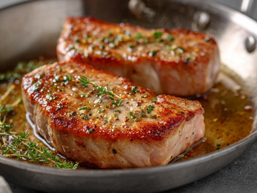 When the chops are almost done, add a tablespoon of butter to the skillet and spoon the melted butter over the pork to enhance flavor and moisture. Once cooked, remove the chops from the pan and let them rest for 5 minutes before serving. Resting allows the juices to redistribute throughout the meat, keeping it tender and flavorful. You can garnish with fresh parsley or squeeze a bit of lemon juice on top for a bright, fresh finish.